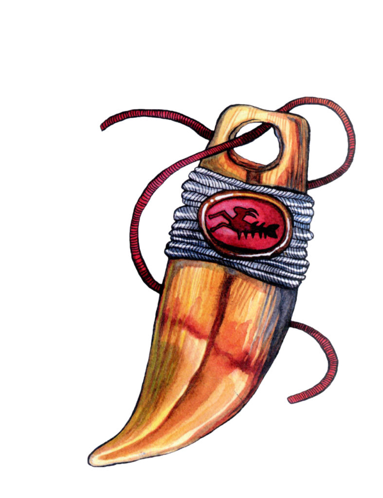 Главным талисманом книги является клык древнего медведя, который получил мальчик по прозвищу Медвежонок в знак спасения детей племени. Так «талисман» проходит сквозь страницы всей книги, становится частью каждой истории, и в конце амулет находят те самые юные археологи Денис и Юлия. Сами читали, много интересного подметили.