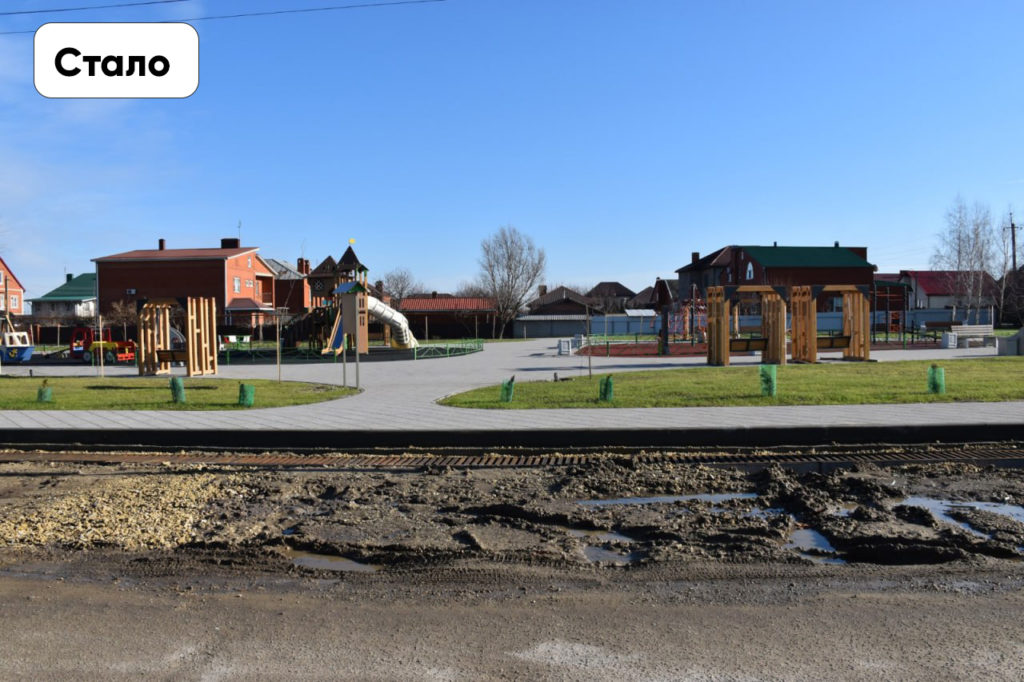 В конце июля приступили к планировке участка. В кратчайшие сроки уложили тротуарную плитку, установили водоотводящие лотки, подготовили основание под покрытие. В сентябре приступили к высадке зелёных насаждений. Произвели облицовку стелы памяти жителям бывшего совхоза Семеноводческого, воевавшим в годы Великой Отечественной войны. В ноябре на территории появилась прогулочная зона с пешеходными дорожками. Были установлены скамейки для отдыха. Проведены коммуникации для уличного освещения, заасфальтированы подъезды к территории. К середине декабря на детских игровых зонах появились малые архитектурные формы. Зона отдыха пополнилась современным уличным освещением. Площадь перед ДК «Первомайский» приобрела новый вид. Здесь была уложена плитка и выполнено устройство водоотведения. Весной посадят цветы, засеют газон.